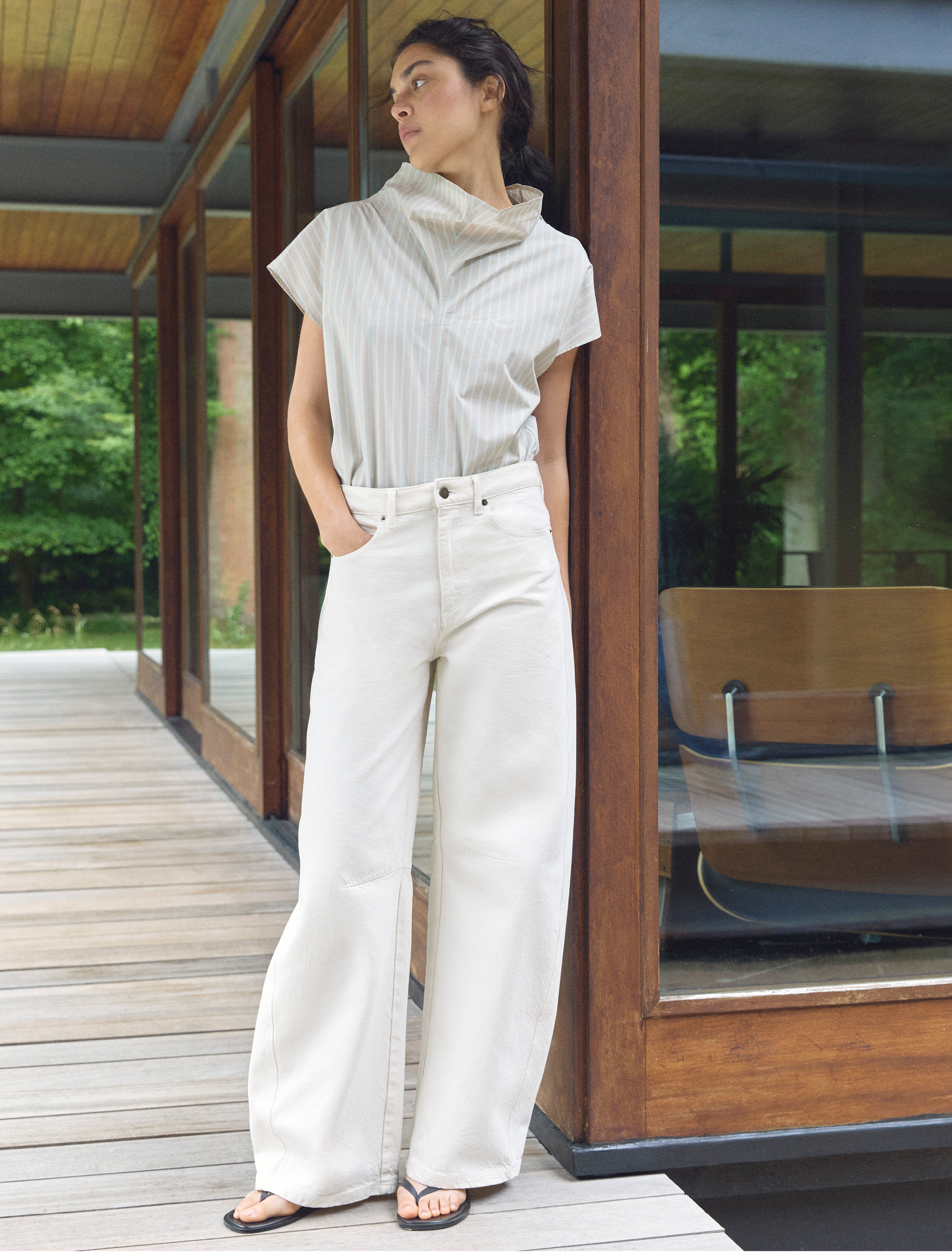 The silhouette suggests rather than exclaims, elegantly displaying the lines of a draped outfit, the volume of trousers animated by the summer breeze, the abstraction of a print, the brilliance of icy blue silk.